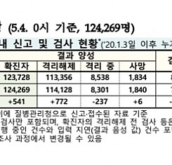 코로나19 국내 확진환자 총 124269명 및 격리해제 114128명·사망 1840명, 5월 4일 0시 기준 541명 추가 확인