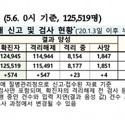코로나19 국내 확진환자 총 125519명 및 격리해제 115491명·사망 1851명, 5월 6일 0시 기준 574명 추가 확인