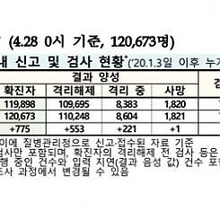 코로나19 국내 확진환자 총 120673명 및 격리해제 110248명·사망 1821명, 4월 28일 0시 기준 775명 추가 확인