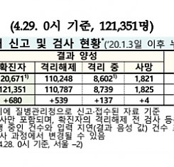 코로나19 국내 확진환자 총 121351명 및 격리해제 110787명·사망 1825명, 4월 29일 0시 기준 680명 추가 확인