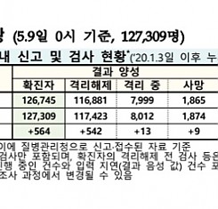 코로나19 국내 확진환자 총 127309명 및 격리해제 117423명·사망 1874명, 5월 9일 0시 기준 564명 추가 확인