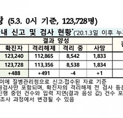 코로나19 국내 확진환자 총 123728명 및 격리해제 113356명·사망 1834명, 5월 3일 0시 기준 488명 추가 확인