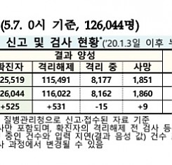 코로나19 국내 확진환자 총 126044명 및 격리해제 116022명·사망 1862명, 5월 7일 0시 기준 525명 추가 확인