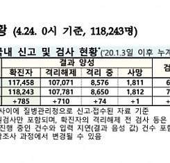 코로나19 국내 확진환자 총 118243명 및 격리해제 107781명·사망 1811명, 4월 24일 0시 기준 785명 추가 확인