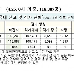 코로나19 국내 확진환자 총 118887명 및 격리해제 108475명·사망 1813명, 4월 25일 0시 기준 644명 추가 확인