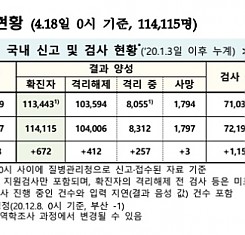 코로나19 국내 확진환자 총 114115명 및 격리해제 104006명·사망 1797명, 4월 18일 0시 기준 672명 추가 확인