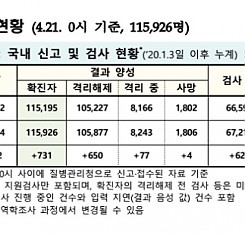 코로나19 국내 확진환자 총 115926명 및 격리해제 105877명·사망 1806명, 4월 21일 0시 기준 731명 추가 확인