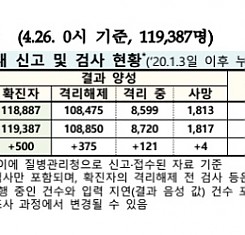 코로나19 국내 확진환자 총 119387명 및 격리해제 108850명·사망 1817명, 4월 26일 0시 기준 500명 추가 확인