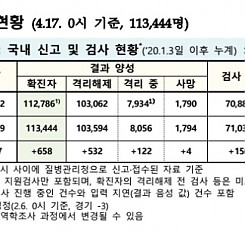 코로나19 국내 확진환자 총 113444명 및 격리해제 103594명·사망 1794명, 4월 17일 0시 기준 658명 추가 확인