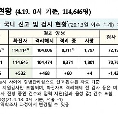 코로나19 국내 확진환자 총 114646명 및 격리해제 104474명·사망 1801명, 4월 19일 0시 기준 532명 추가 확인