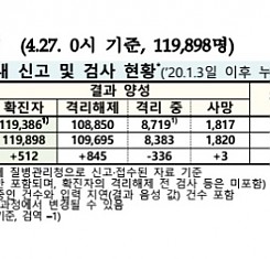 코로나19 국내 확진환자 총 119898명 및 격리해제 109695명·사망 1820명, 4월 27일 0시 기준 512명 추가 확인