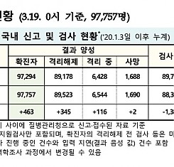 코로나19 국내 확진환자 총 97757명 및 격리해제 89523명·사망 1690명, 3월 19일 0시 기준 463명 추가 확인