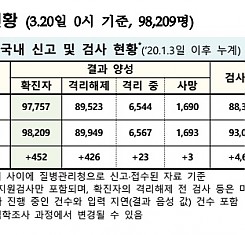 코로나19 국내 확진환자 총 98209명 및 격리해제 89949명·사망 1693명, 3월 20일 0시 기준 452명 추가 확인