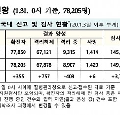 코로나19 국내 확진환자 총 78205명 및 격리해제 67878명·사망 1420명, 1월 31일 0시 기준 355명 추가 확인