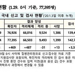 코로나19 국내 확진환자 총 77395명 및 격리해제 66503명·사망 1399명, 1월 29일 0시 기준 469명 추가 확인