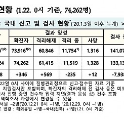 코로나19 국내 확진환자 총 74262명 및 격리해제 61415명·사망 1328명, 1월 22일 0시 기준 346명 추가 확인