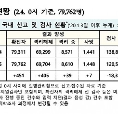 코로나19 국내 확진환자 총 79762명 및 격리해제 69704명·사망 1448명, 2월 4일 0시 기준 451명 추가 확인