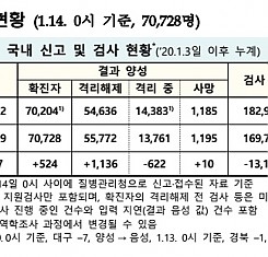 코로나19 국내 확진환자 총 70728명 및 격리해제 55772명·사망 1195명, 1월 14일 0시 기준 524명 추가 확인