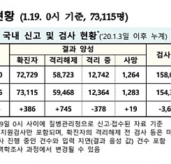 코로나19 국내 확진환자 총 73115명 및 격리해제 59468명·사망 1283명, 1월 19일 0시 기준 386명 추가 확인