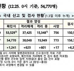 코로나19 국내 확진환자 총 54770명 및 격리해제 38048명·사망 773명, 12월 25일 0시 기준 1241명 추가 확인
