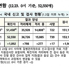 코로나19 국내 확진환자 총 52550명 및 격리해제 36726명·사망 739명, 12월 23일 0시 기준 1092명 추가 확인