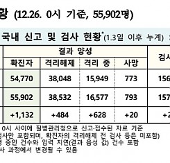 코로나19 국내 확진환자 총 55902명 및 격리해제 38532명·사망 793명, 12월 26일 0시 기준 1132명 추가 확인