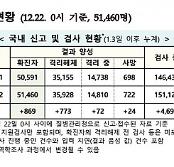 코로나19 국내 확진환자 총 51460명 및 격리해제 35928명·사망 722명, 12월 22일 0시 기준 869명 추가 확인