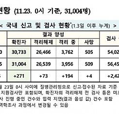 코로나19 국내 확진환자 총 31,004명 및 격리해제 26539명·사망 509명, 11월 23일 0시 기준 271명 추가 확인
