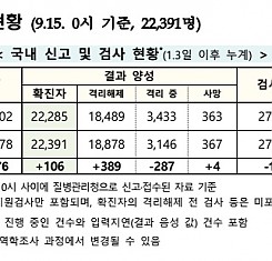 코로나19 국내 확진환자 총 22391명 및 격리해제 18878명·사망 367명, 9월 15일 0시 기준 106명 추가 확인