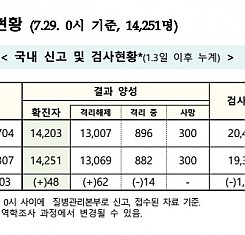 코로나19 국내 확진환자 총 14251명 및 격리해제 13069명·사망 300명, 7월 29일 0시 기준 48명 추가 확인