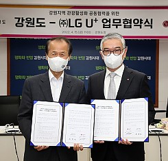 LG유플러스(대표 황현식/www.uplus.co.kr)와 강원도(도지사 최문순)는 지역 관광 활성화를 위한 업무협약(MOU)을 체결했다고 17일 밝혔다. 부산광역시 해운대구에 이어 고객의 일상 속 새로운 경험을 제공하려는 LG유플러스의 두 번째 활동이다.춘천시 소재 강원도청에서 열린 업무협약식에는 정수헌 LG유플러스 Consumer부문장과 최문순 강원도지사…
