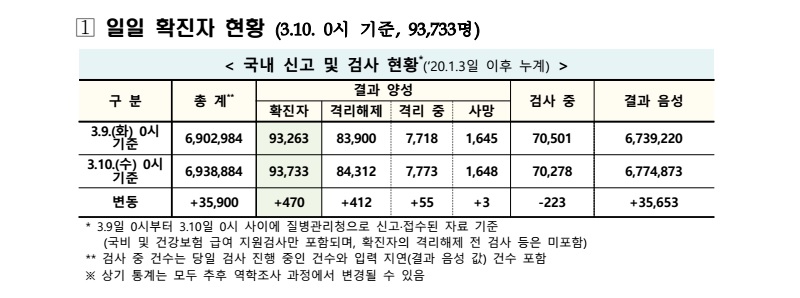 보건·의료 | 코로나19 국내 확진환자 총 93733명 및 격리해제 84312명·사망 1645명, 3월 10일 0시 기준 470명 추가 확인