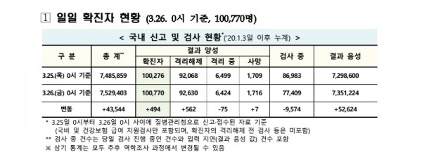 보건·의료 | 코로나19 국내 확진환자 총 100770명 및 격리해제 92630명·사망 1716명, 3월 26일 0시 기준 494명 추가 확인