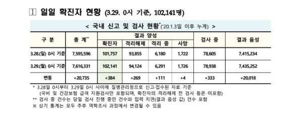 코로나19 국내 확진환자 총 102141명 및 격리해제 94124명·사망 1726명, 3월 29일 0시 기준 384명 추가 확인