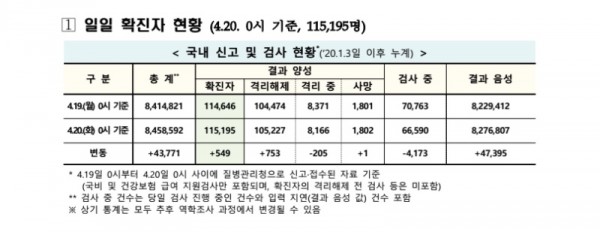 코로나19 국내 확진환자 총 115195명 및 격리해제 105227명·사망 1802명, 4월 20일 0시 기준 549명 추가 확인