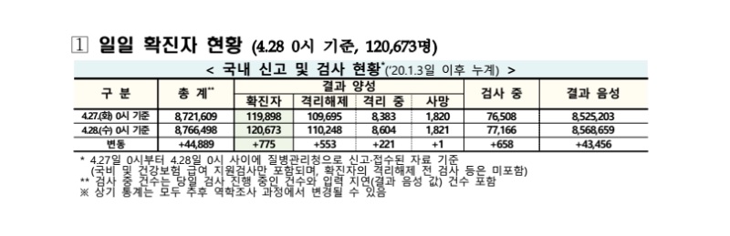코로나19 국내 확진환자 총 120673명 및 격리해제 110248명·사망 1821명, 4월 28일 0시 기준 775명 추가 확인