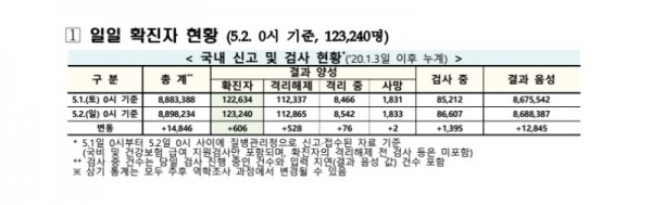 보건·의료 | 코로나19 국내 확진환자 총 123240명 및 격리해제 112865명·사망 1833명, 5월 2일 0시 기준 606명 추가 확인