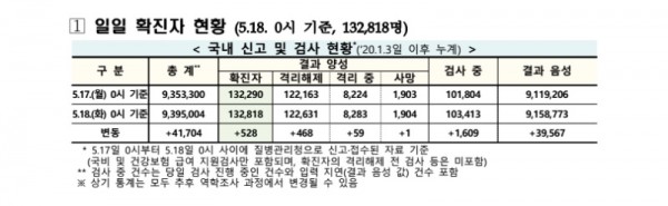 코로나19 국내 확진환자 총 132818명 및 격리해제 122631명·사망 1904명, 5월 18일 0시 기준 528명 추가 확인