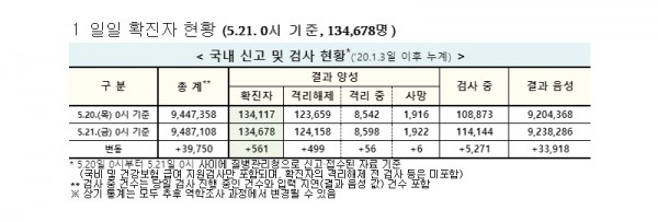 보건·의료 | 코로나19 국내 확진환자 총 134678명 및 격리해제 124158명·사망 1922명, 5월 21일 0시 기준 561명 추가 확인