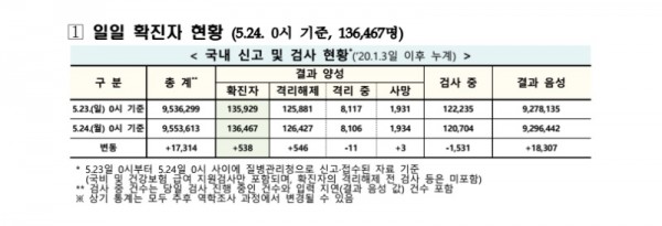 보건·의료 | 코로나19 국내 확진환자 총 136467명 및 격리해제 126427명·사망 1934명, 5월 24일 0시 기준 538명 추가 확인