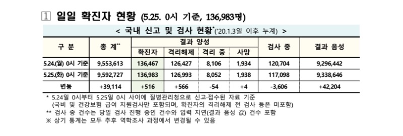 보건·의료 | 코로나19 국내 확진환자 총 136983명 및 격리해제 126993명·사망 1938명, 5월 25일 0시 기준 516명 추가 확인