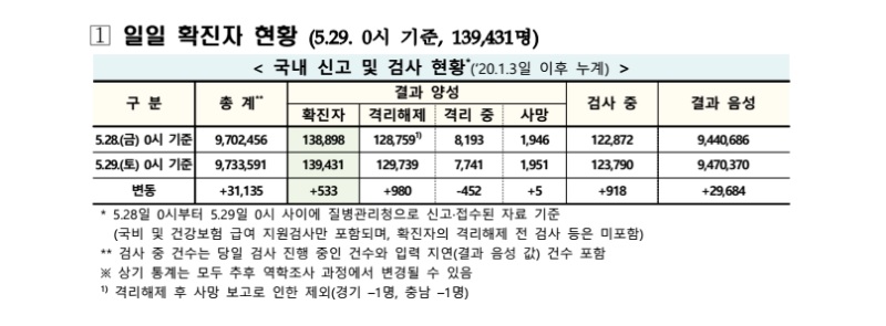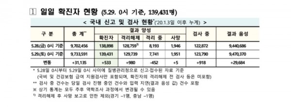 보건·의료 | 코로나19 국내 확진환자 총 139431명 및 격리해제 129739명·사망 1951명, 5월 29일 0시 기준 533명 추가 확인