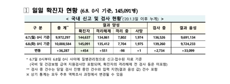 보건·의료 | 코로나19 국내 확진환자 총 145091명 및 격리해제 135412명·사망 1975명, 6월 8일 0시 기준 454명 추가 확인