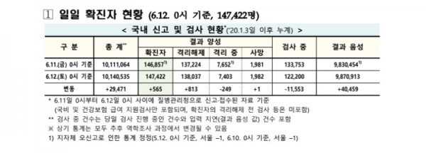 보건·의료 | 코로나19 국내 확진환자 총 147422명 및 격리해제 138037명·사망 1982명, 6월 12일 0시 기준 565명 추가 확인