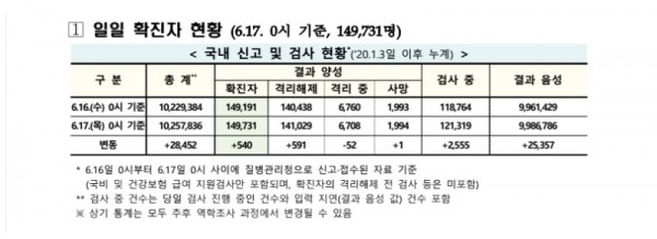 코로나19 국내 확진환자 총 149731명 및 격리해제 141029명·사망 1994명, 6월 17일 0시 기준 540명 추가 확인