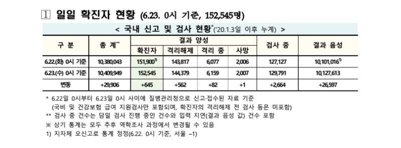 보건·의료 | 코로나19 국내 확진환자 총 152545명 및 격리해제 144379명·사망 2007명, 6월 23일 0시 기준 645명 추가 확인