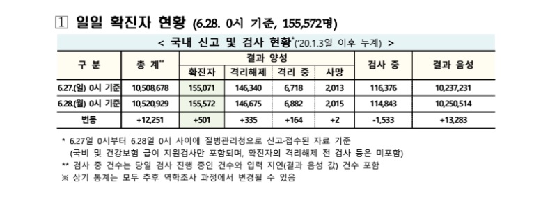 보건·의료 | 코로나19 국내 확진환자 총 155572명 및 격리해제 146675명·사망 2015명, 6월 28일 0시 기준 501명 추가 확인