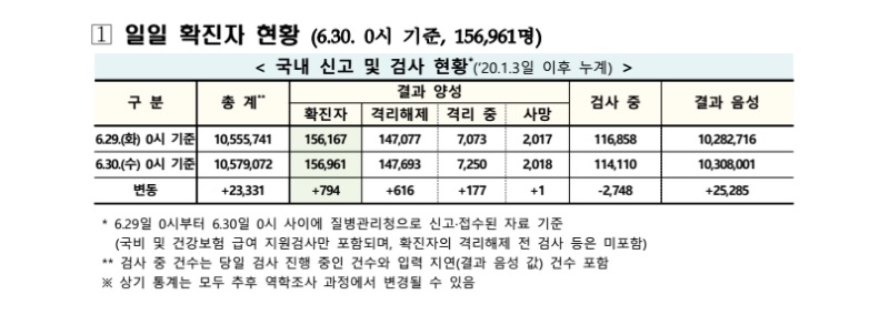 보건·의료 | 코로나19 국내 확진환자 총 156961명 및 격리해제 147693명·사망 2018명, 6월 30일 0시 기준 794명 추가 확인