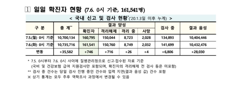 보건·의료 | 코로나19 국내 확진환자 총 161541명 및 격리해제 150760명·사망 2032명, 7월 6일 0시 기준 746명 추가 확인