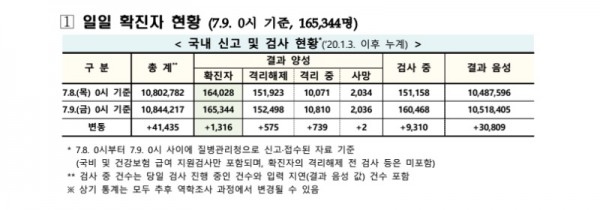 보건·의료 | 코로나19 국내 확진환자 총 165344명 및 격리해제 152498명·사망 2036명, 7월 9일 0시 기준 1316명 추가 확인